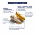 La sinergia entre Rhodiola, ginseng de Siberia y ginseng indio favorece la adaptación del organismo a cualquier forma de estrés, ya sea físico o emocional. Estos activos adaptógenos apoyan la claridad mental desde la mañana y permiten una mejor gestión de la fatiga. Ashwagandha KSM-66 aporta un apoyo específico en períodos de tensión intelectual, contribuyendo a la estabilidad emocional y a la vitalidad diaria.